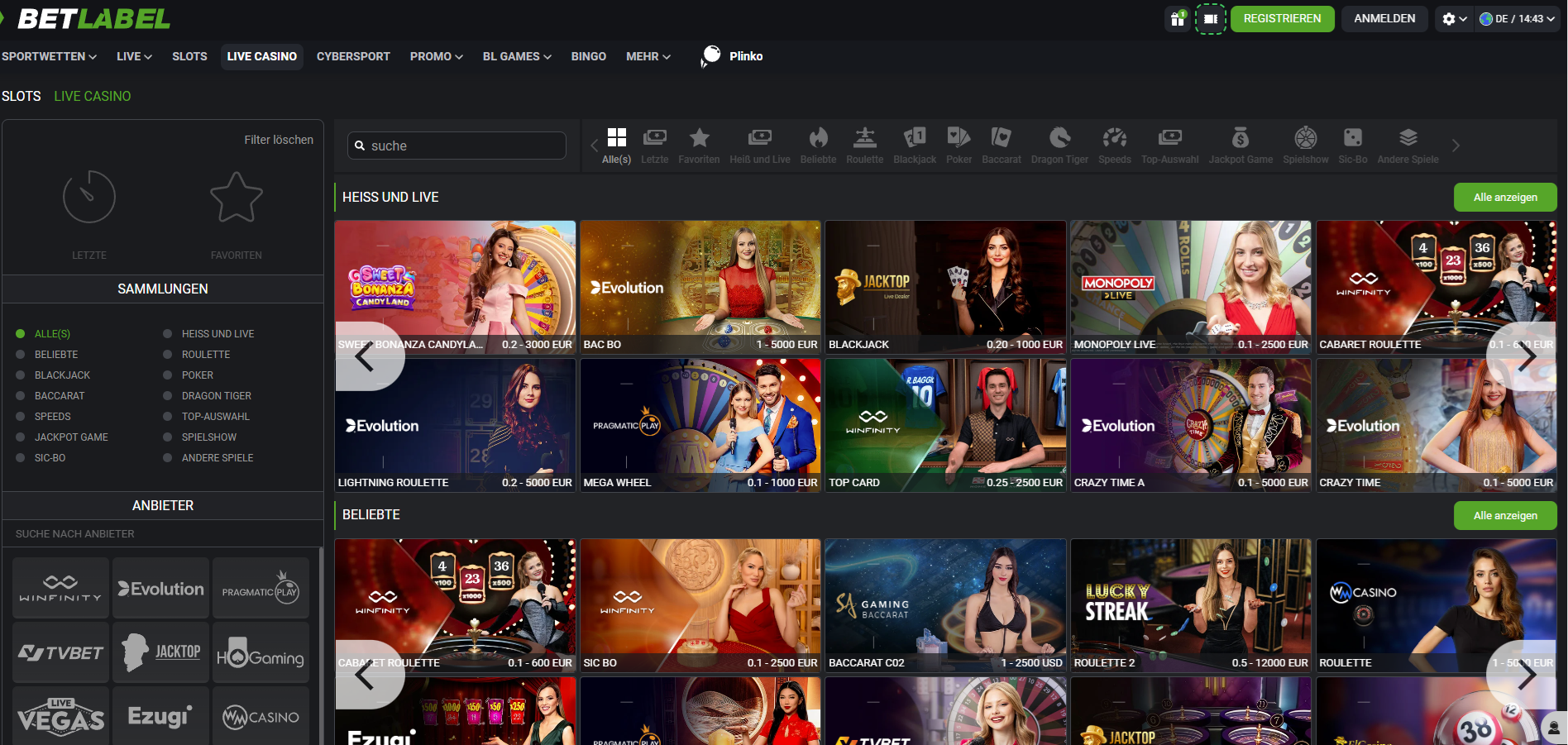 BetLabel ist primär ein Sportwettenanbieter – das Casino ist das Nebenprodukt. Die Startseite zeigt Sport, der Casino-Bereich muss gezielt angesteuert werden. Das ist im Vergleich zu allen anderen getesteten Casinos einzigartig: