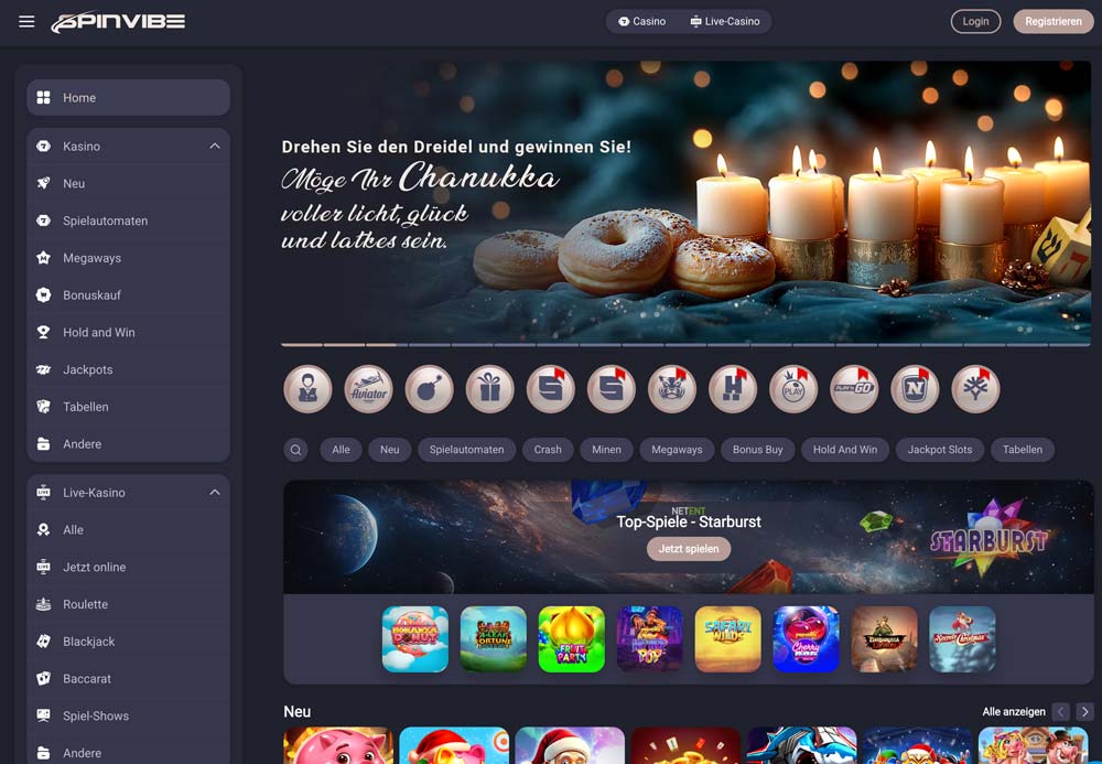 Die Startseite bietet einen guten Überblick über aktuelle Aktionen, beliebte Spiele und neue Slots. Besonders praktisch ist die Suchfunktion, mit der man gezielt nach bestimmten Spielen oder Providern suchen kann. In unseren Spinvibe Erfahrungen zeigte sich, dass auch bei einer großen Spielauswahl die Übersichtlichkeit nicht verloren geht.